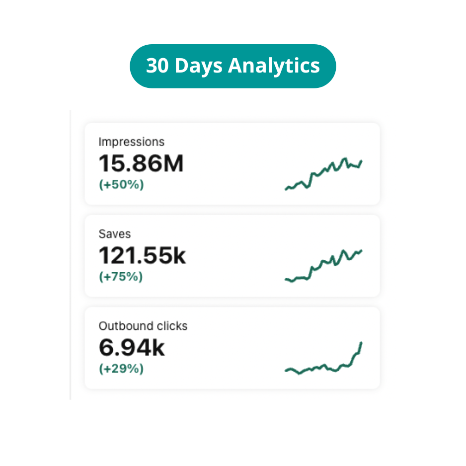 Focus on creating new, high-quality content. Then we can take care of your Pinterest account following the latest Best Practices and Trends. Give us time, you’ll need at least 3-6 months to see results on Pinterest, but the results will be worth the wait.